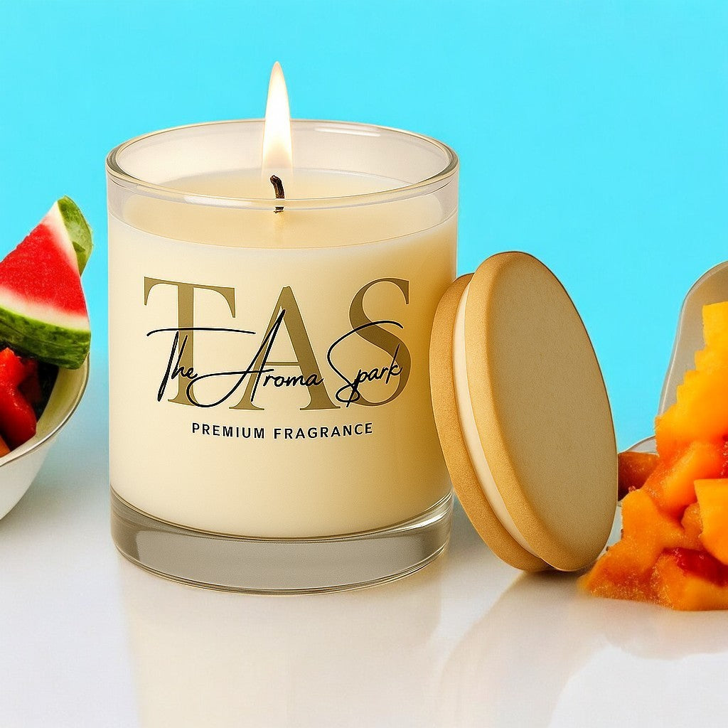 A refreshing blend of Watermelon, Mango, Mixed Fruits, and Aqua notes, poured in a 200ml transparent glass jar with sustainable bamboo lid.
